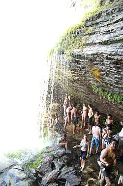 Nach ca. weiteren 20 Minuten Fußmarsch, kamen wir an dem zweiten Wasserfall - dem Salto Hacha - an. Hier stürzte schon erheblich mehr Wasser hinab. Ein starkes Grollen war zu spüren. In der Regenzeit wäre der Salto Hacha nicht mehr passierbar. Wieder wurden unsere Kameras eingepackt und ab ging es. Wow, dass war schon was. Die pure Naturgewalt. Völlig nass kamen wir auf der anderen Seite an.